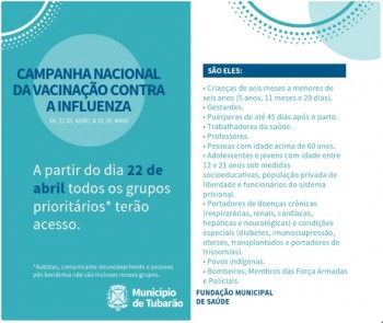 A expectativa é que o máximo possível da população prioritária seja vacinada, número que chega a mais de 22 mil pessoas. Em Tubarão nos 15 primeiros dias da campanha, mais de 2.300 doses foram aplicadas, o maior número de idosos e crianças, 1.033 e 1.009, respectivamente. Ainda só 11% da cobertura prioritária foi alcançada. É de extrema relevância que todos se vacinem e se protejam, relata a gerente de saúde do município Chaiana Esmeraldino Marcon. “A única forma eficiente de prevenção, é a vacina”.